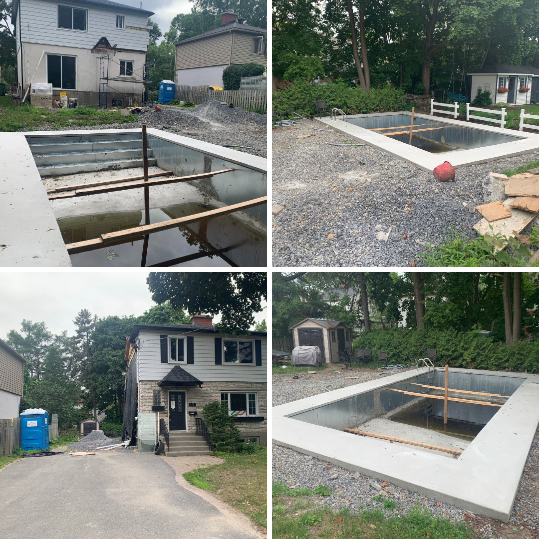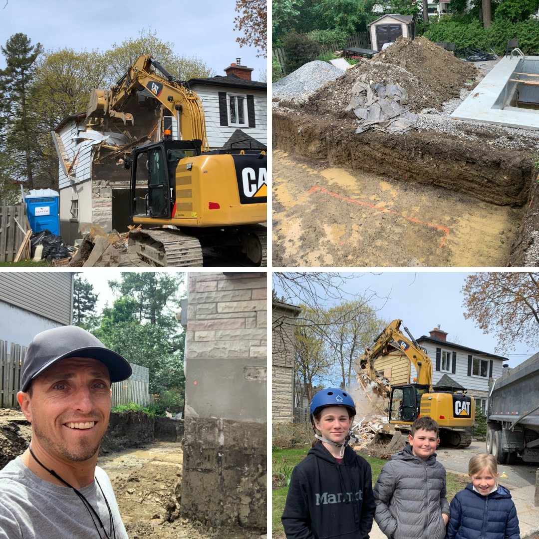 We were then just weeks away from our planned start date and now had to decide: "Do we go ahead with it? Are we crazy to be doing a renovation under these conditions? Have we come too far to turn back now?" The contractors were all lined up, the timeline was planned out to a tee, and the cost of lumber was up by more than 40%. What could possibly go wrong? Turns out everything can! The big machine came to tear down the old garage on April 30th. The pool was supposed to start going in a few days later, but instead we waited over 2 weeks before that happened. The pool then took about a month, apparently due to a shortage of concrete. Finally, by mid-June the pool decking was complete (still no liner) and we were ready to dig for the foundations to go in for the new extension to the house.