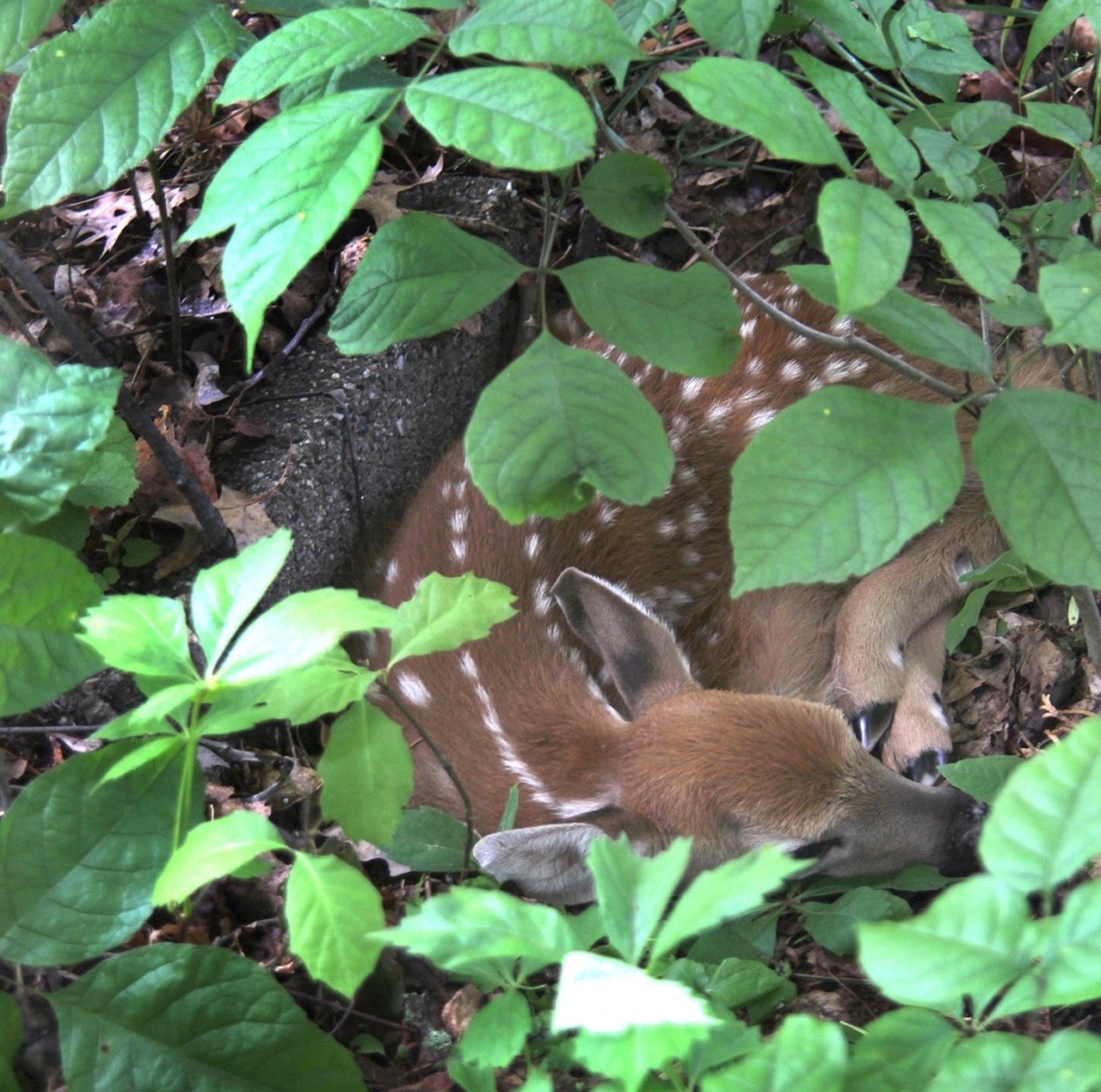 My son Max was walking along when he came upon a small clearing in the woods covered in ferns. Without paying attention to his footing, he stepped down into a deer bed - with a baby deer sleeping in it!
